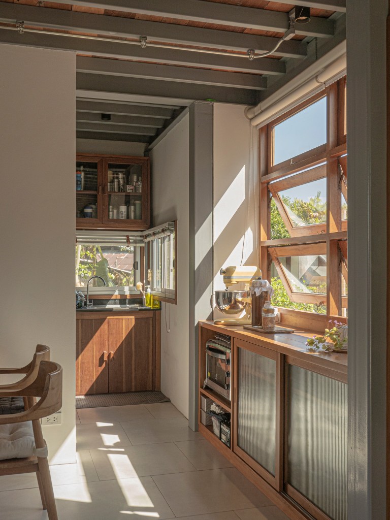 ครัวที่อยู่ติดกับพื้นที่นั่งเล่นถูกออกแบบให้ใช้งานจริง ไม่ใช่เพียงครัวโชว์ เตา ซิงค์ และพื้นที่เตรียมอาหารมีแสงธรรมชาติเพียงพอ พร้อมช่องลมระบายกลิ่นได้ดี เป็นพื้นที่ที่ผู้อยู่อาศัยสามารถลงมือทำอาหาร พูดคุยกับคนในบ้าน หรือมองออกไปข้างนอกได้โดยไม่รู้สึกแยกขาด