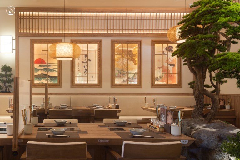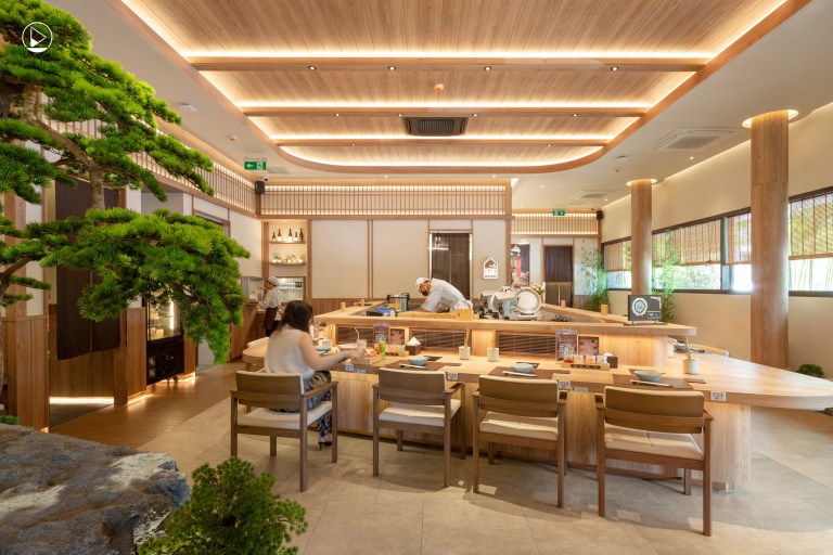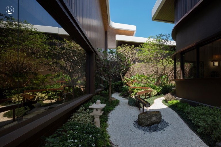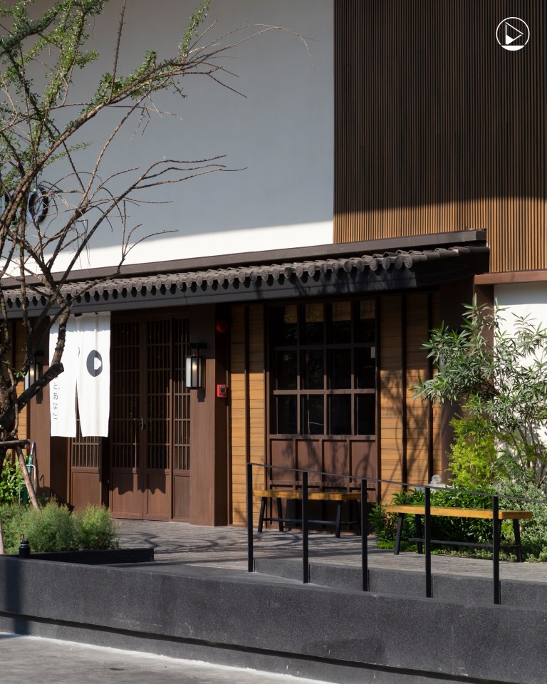 อีกประเด็นสำคัญที่ผู้ออกแบบเน้นคือการจัดการกับช่องเปิดและสัดส่วนของพื้นที่ ที่ไม่ใช่แค่เรื่องฟังก์ชันแต่ยังช่วยสร้างบรรยากาศ ทำให้ทุกมุมทุกส่วนของพื้นที่กลมกลืนและส่งเสริมกันอย่างเป็นธรรมชาติ สำหรับโจทย์หลักที่ผู้ออกแบบต้องเผชิญ คือการรวมพื้นที่ของร้านสามร้านที่มีคาแรคเตอร์และเอกลักษณ์แตกต่างกันอย่างชัดเจน แต่ยังต้องอยู่ภายใต้กรอบเดียวกันทั้งในแง่ของโครงสร้างและอารมณ์ เพื่อให้เกิดความลงตัวเหมือนหมู่บ้านญี่ปุ่นที่ตั้งอยู่กลางเมืองไทยแต่ละร้านก็ยังมีเสน่ห์และเรื่องราวของตัวเอง