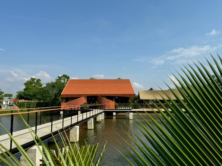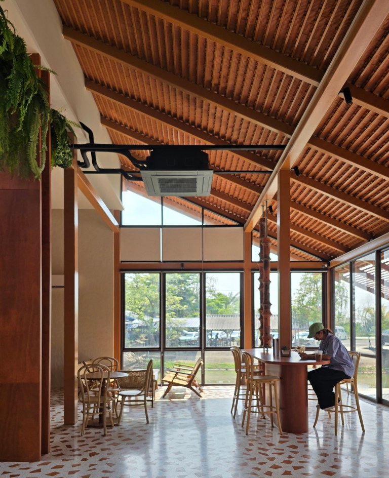 อาคารตั้งอยู่กลางน้ำ สอดรับไปกับบริบทเดิมของ ‘ร้านอาหารชายทุ่ง’ ร้านอาหารริมสระน้ำเพื่อให้คาเฟ่นี้เป็นอีกหนึ่งโซนสำหรับรองรับลูกค้าจากฝั่งร้านอาหาร