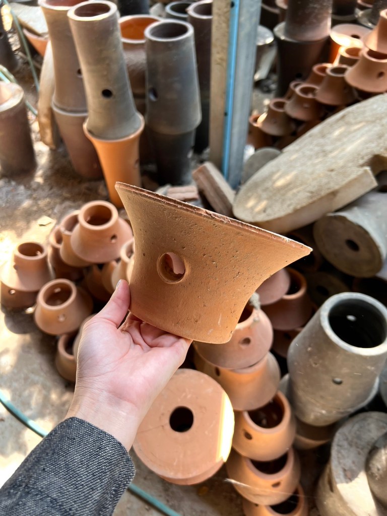ทีมออกแบบพัฒนาผลงานอยู่ประมาณ 2 ปีกว่าที่ ‘ดินเผาด่านเกวียน’ งานฝีมือที่ถูกเลือกหยิบมาใช้จะขึ้นเป็นรูปเป็นร่างออกมาเป็นคาเฟ่ ไม่ใช่แค่ในฐานะของตกแต่ง แต่เป็นองค์ประกอบหลักของพื้นที่ ทั้งโทนสีส้มอิฐที่นำมาใช้เป็นแกนกลางของการออกแบบ ไปจนถึงการเพิ่มลูกเล่นโดยเอา ‘จ๊อ’ (saggars) เครื่องปั้นทรงเว้าโค้งที่มีฟังก์ชันเป็นฐานรองชิ้นงานอื่น ๆ เมื่อเข้าเตาเผาด่านเกวียน หยิบชิ้นงานที่เคยถูกวางไว้เงียบ ๆ ในโรงเผา ถูกนำมาจัดเรียงใหม่เป็นประติมากรรมขนาดย่อมกลางร้าน ได้ดีเทลการออกแบบที่แปลกใหม่แล้ว ยังทำให้คนภายนอกได้ทำความรู้จักกับเครื่องปั้นดินเผาชิ้นนี้ในมุมมองใหม่ที่แตกต่างออกไป เปลี่ยนของที่เคยอยู่เบื้องหลัง ให้กลายเป็นบทสนทนาใหม่ของผู้มาเยือน