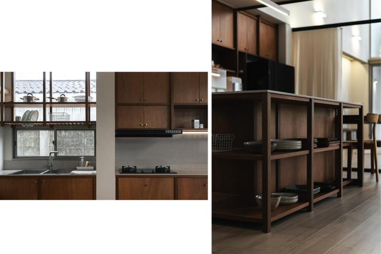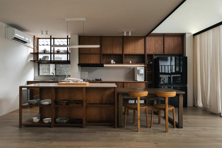 เฟอร์นิเจอร์และวัสดุที่ใช้ภายในบ้าน ล้วนเป็นผลของการตีความสารตั้งต้นเดียวกัน จากตัวทางเดินจงกรมสู่รายละเอียดในทุกองค์ประกอบ ไม่ว่าจะเป็น คอนกรีตโชว์ผิว ไม้จริงที่คงร่องรอยธรรมชาติไว้ หรือแม้แต่เฟรมของช่องแสงที่กลายเป็นกรอบภาพ ที่แทนที่ผนังแขวนภาพในบ้านเก่าของครอบครัวศิลปิน