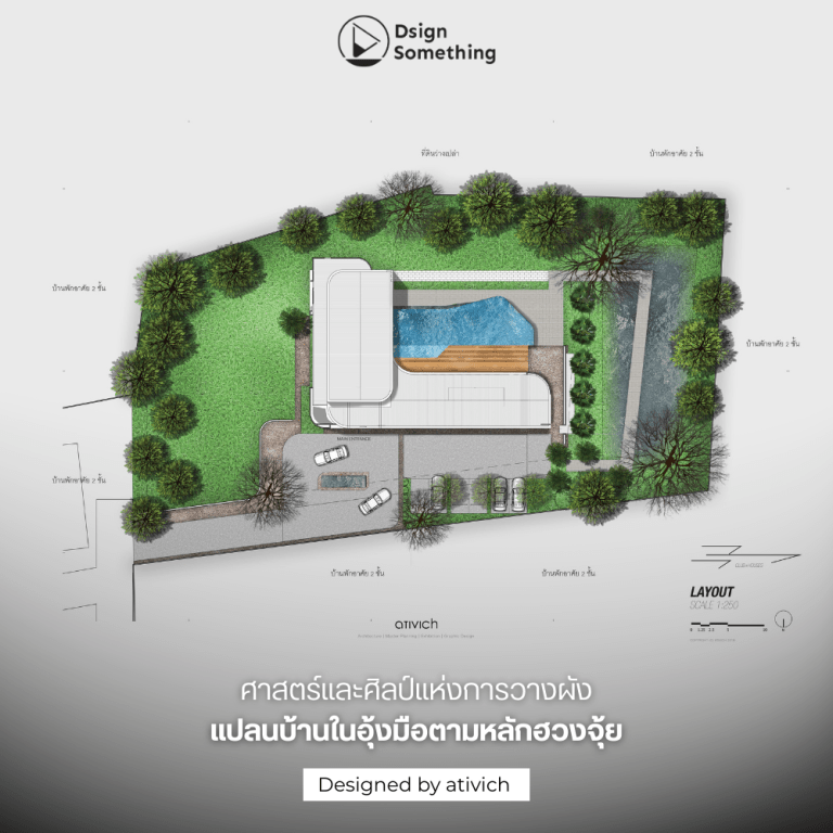 การจัดวางนี้ยังส่งผลดีในแง่การออกแบบภูมิสถาปัตยกรรม ทำให้สามารถสร้างพื้นที่สีเขียวและบ่อน้ำล้อมรอบตัวบ้าน เพื่อสร้าง Microclimate ที่เย็นสบาย และเป็นปราการธรรมชาติที่ช่วยกรองเสียงและฝุ่นจากภายนอก เป็นการผสานศาสตร์ความเชื่อเข้ากับศิลปะการออกแบบสมัยใหม่ได้อย่างลงตัว
