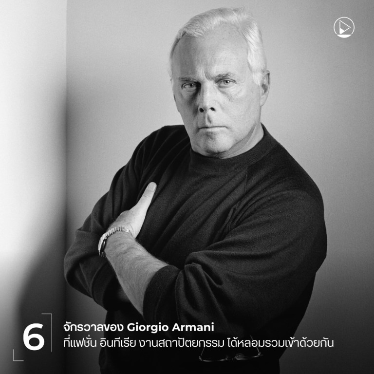 แนวคิดการออกแบบแฟชั่นของเขามีความเรียบง่ายและทรงพลัง เขาได้ถ่ายทอดอัตลักษณ์ดังกล่าวไปสู่สไตล์เฟอร์นิเจอร์และการออกแบบเชิงพื้นที่ในอาณาจักรของเขามามากกว่า 50 ปี ตั้งแต่ บูติก Retail Shop ของ Armani ทั่วโลก ไปจนถึงพิพิธภัณฑ์ โรงละคร โรงแรม และ Penthouse ส่วนตัว ทุกพื้นที่ล้วนถูกหล่อหลอมด้วยปรัชญาการออกแบบเดียวกันคือ การลดทอน ความสง่างามที่อยู่เหนือการเวลา รวมถึงการ Collaboration กับสถาปนิกชื่อดังในการสร้างประสบการเชิงพื้นที่ที่แตกต่าง